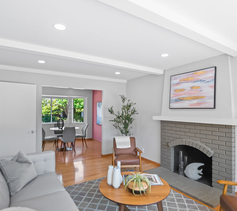 Inside, a thoughtful layout offers separate family and living rooms. The kitchen boasts dining nook with bay window, deep countertops, fresh white cabinets, and stainless steel appliances.