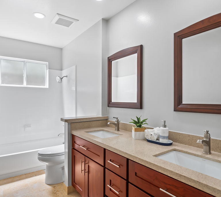 Retreat to the primary suite complete with sliding doors to the backyard and bathroom with rich cherry built-in cabinets, generous counter space, and shower with stylish tile detailing.