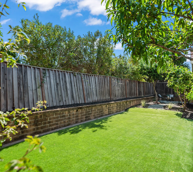The backyard features low-maintenance turf; fruiting trees including lemon, orange, peach, and plum; and paved seating area that invites outdoor dining, relaxing, and entertaining.